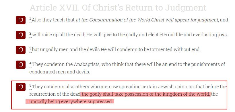 “In like manner they (our churches) condemn those who circulate the judaizing notion, that, prior to the resurrection of the dead, the pious will engross the government of the world, and the wicked be everywhere oppressed.” [This is an archaic meaning of “engross”— more like “encompass”].